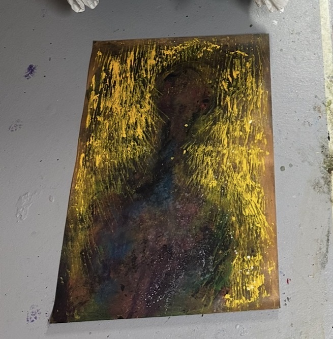 I treat the recurring human-like silhouettes not as figures, but as spatial anchors.